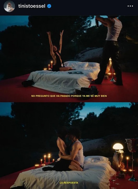 Las frases que acompañan cada toma —“Lo que a mí me pasa, a vos también”, “Una noche más…”, “Para acordarnos otra vez de nosotros”, “No pregunto qué ha pasado porque ya me sé muy bien la respuesta”— son partes de la canción que se lanzará el jueves.