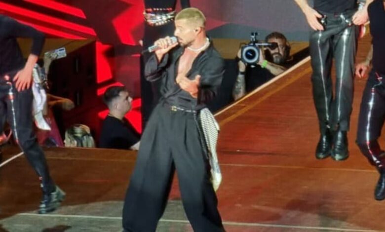 A las 21:05, las luces se apagaron y el grito fue inmediato, ensordecedor. La apertura con “Pegate” desató una explosión colectiva, mientras el artista apareció sobre una tarima, vestido con un traje negro amplio con detalles plateados que capturó todas las miradas. Sin pausa, llegaron “María”, “Adrenalina” “Bombón de azúcar”, sosteniendo un arranque demoledor.